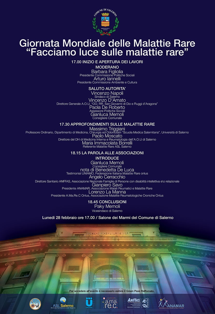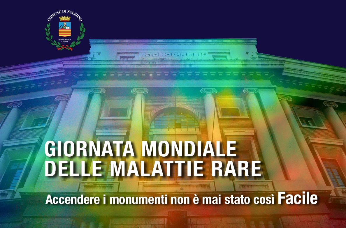 Per la Giornata Mondiale delle Malattie Rare, il Comune di Salerno sarà illuminato di fucsia, azzurro e verde: i colori che rappresentano la sensibilizzazione verso le malattie rare, e verso gli aspetti medici e sociali a esse legati: la ricerca scientifica e la tutela dei malati e delle loro famiglie.